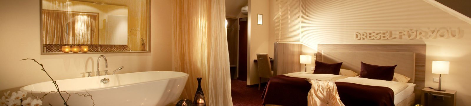 Die besonders romantische Ausgestaltung unserer Suite verleiht ihr das einzigartige Ambiente. Alle Bestandteile und Dekoelemente fügen sich zu einem harmonischen Ensemble zusammen. Das dunkle Weinrot des Hochflor- Teppichs passt perfekt zum leuchtend warmen Goldton. Das raffinierte Lichtkonzept sorgt für eine stimmungsvolle Atmosphäre. Kein Wunder, dass unsere Suite sehr gern von jungen und älteren Paaren gebucht wird. Auch als Honeymoonsuite ist sie äußerst beliebt.